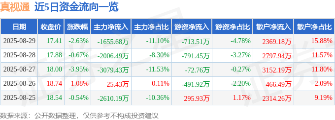 证券之星消息,截至2025年8月29日收盘,真视通(002771)报收于17.41元,下跌2.63%,换手率4.88%,成交量8.51万手,成交额1.49亿元。