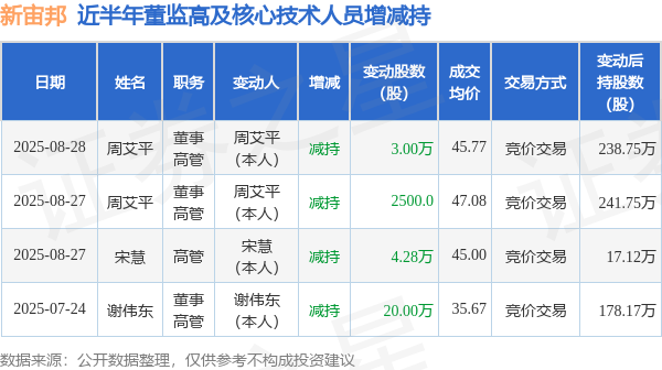 新宙邦近半年内的董监高及核心技术人员增减持详情如下: