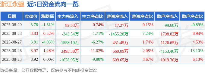 证券之星消息,截至2025年8月29日收盘,浙江永强(002489)报收于3.78元,下跌1.31%,换手率1.54%,成交量29.41万手,成交额1.12亿元。