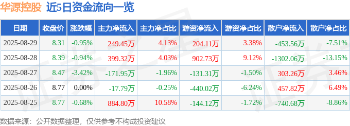 证券之星消息,截至2025年8月29日收盘,华源控股(002787)报收于8.31元,下跌0.95%,换手率2.89%,成交量7.24万手,成交额6040.84万元。