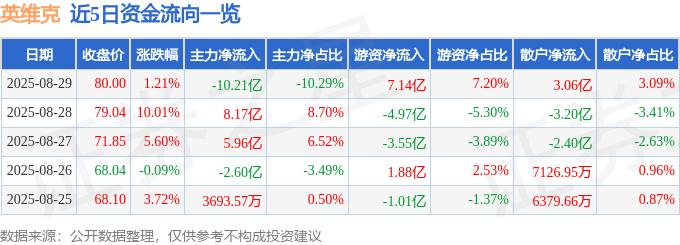 证券之星消息,截至2025年8月29日收盘,英维克(002837)报收于80.0元,上涨1.21%,换手率14.4%,成交量121.3万手,成交额99.23亿元。