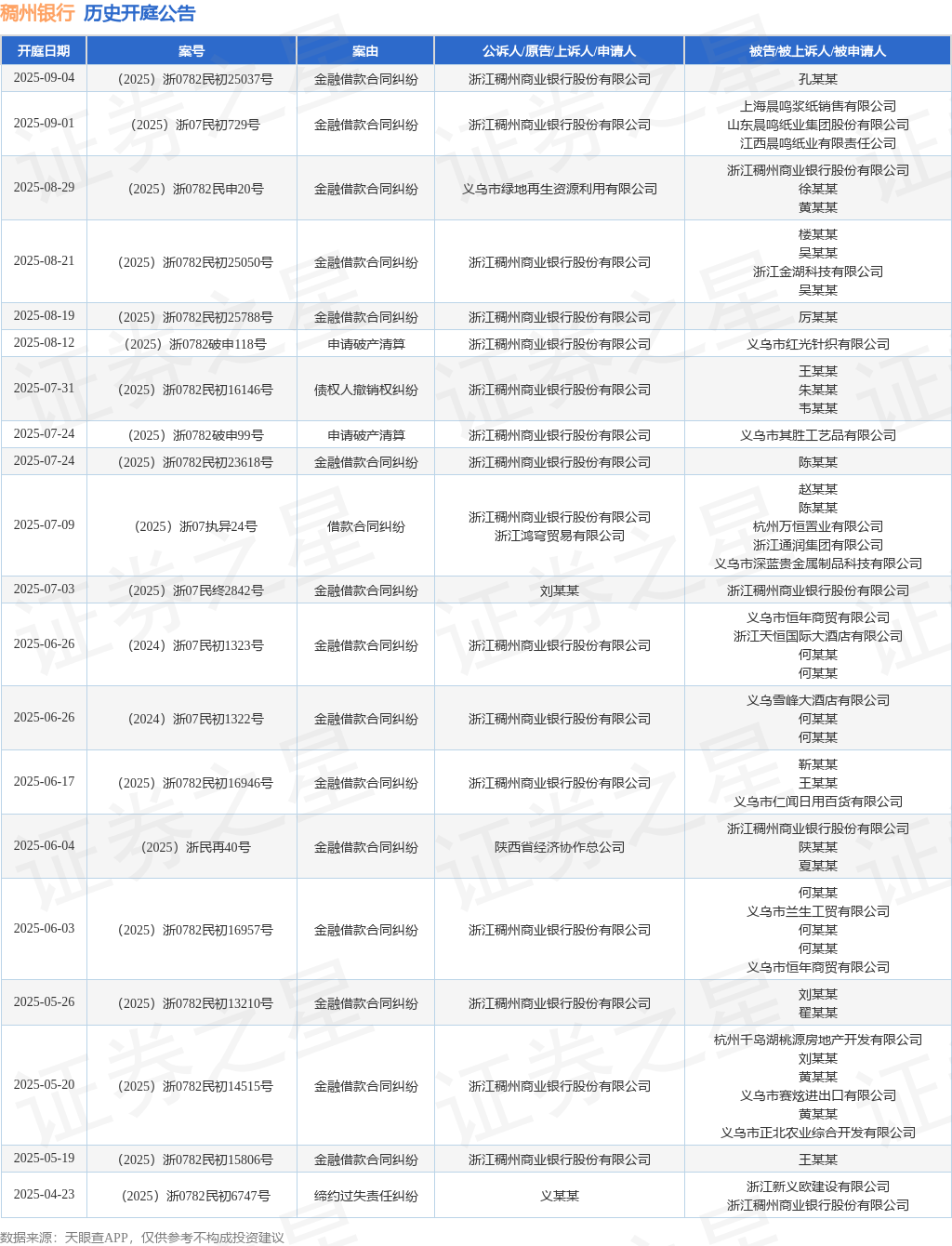 案号:(2025)浙07民初729号根据统计,近一年内以浙江稠州商业银行股份有限公司为当事人的历史开庭公告有30则,其中案由为“金融借款合同纠纷”的公告以23则居首,其次为“申请破产清算”有2则,“缔约过失责任纠纷”有2则。历史开庭公告(前20条)如下: