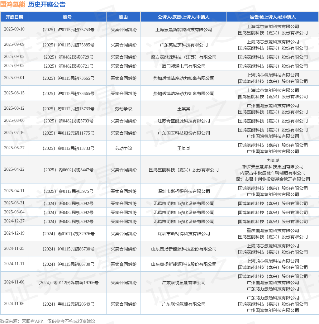 案号:(2025)沪0115民初73665号根据统计,近一年内以国鸿氢能科技(嘉兴)股份有限公司为当事人的历史开庭公告有22则,其中案由为“买卖合同纠纷”的公告以20则居首,其次为“劳动争议”有2则。历史开庭公告(前20条)如下:
