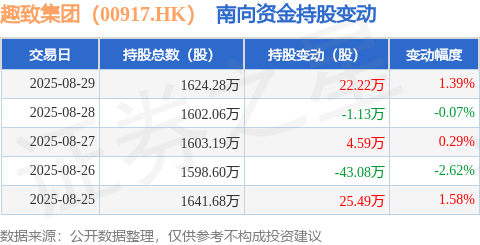 证券之星消息,8月29日南向资金增持22.22万股趣致集团(00917.HK)。近5个交易日中,获南向资金增持的有3天,累计净增持8.09万股。近20个交易日中,获南向资金增持的有18天,累计净增持199.47万股。截至目前,南向资金持有趣致集团(00917.HK)1624.28万股,占公司已发行普通股的6.1%。