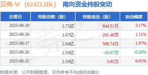 证券之星消息,8月29日南向资金增持844.51万股贝壳-W(02423.HK)。近5个交易日中,获南向资金增持的有4天,累计净增持1597.61万股。近20个交易日中,获南向资金增持的有19天,累计净增持4750.18万股。截至目前,南向资金持有贝壳-W(02423.HK)2.75亿股,占公司已发行普通股的7.69%。