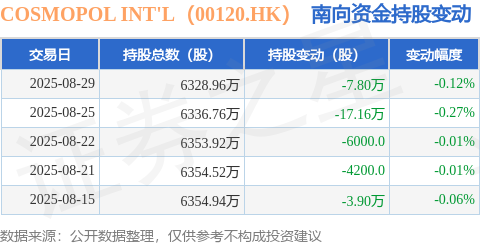 证券之星消息,8月29日南向资金减持7.8万股COSMOPOL INT'L(00120.HK)。近5个交易日中,获南向资金减持的有5天,累计净减持29.88万股。近20个交易日中,获南向资金减持的有20天,累计净减持239.64万股。截至目前,南向资金持有COSMOPOL INT'L(00120.HK)6328.96万股,占公司已发行普通股的4.72%。