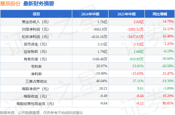据证券之星公开数据整理,近期慧辰股份(688500)发布2025年中报。根据财报显示,慧辰股份营收上升亏损收窄。截至本报告期末,公司营业总收入2.02亿元,同比上升14.79%,归母净利润-3202.51万元,同比上升11.11%。按单季度数据看,第二季度营业总收入1.25亿元,同比上升19.16%,第二季度归母净利润-1436.8万元,同比上升16.34%。