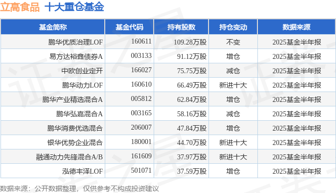 持有立高食品最多的基金为鹏华优质治理LOF,目前规模为7.02亿元,最新净值1.3506(8月29日),较上一交易日上涨0.97%,近一年上涨69.53%。该基金现任基金经理为陈金伟。