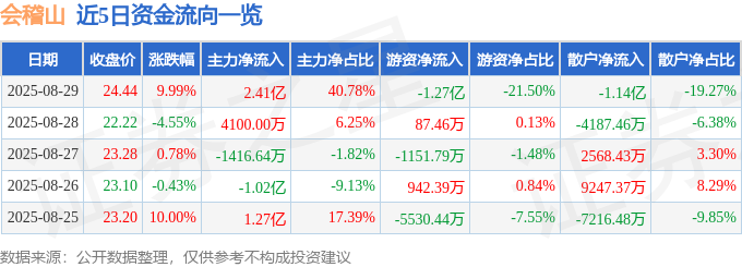 8月29日的资金流向数据方面,主力资金净流入2.41亿元,占总成交额40.78%,游资资金净流出1.27亿元,占总成交额21.5%,散户资金净流出1.14亿元,占总成交额19.27%。