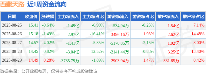 资金流向数据方面,本周西藏天路主力资金合计净流出9.28亿元,游资资金合计净流出1447.15万元,散户资金合计净流入9.42亿元。本周资金流向一览见下表: