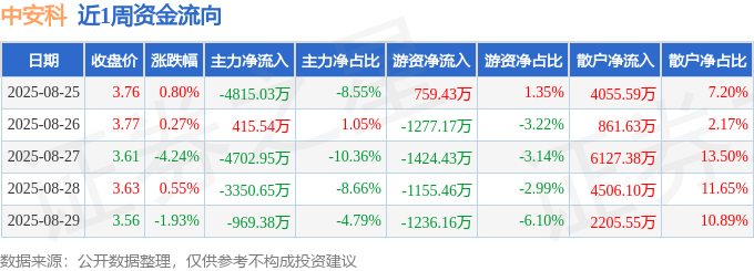 资金流向数据方面,本周中安科主力资金合计净流出1.34亿元,游资资金合计净流出4333.79万元,散户资金合计净流入1.78亿元。本周资金流向一览见下表:
