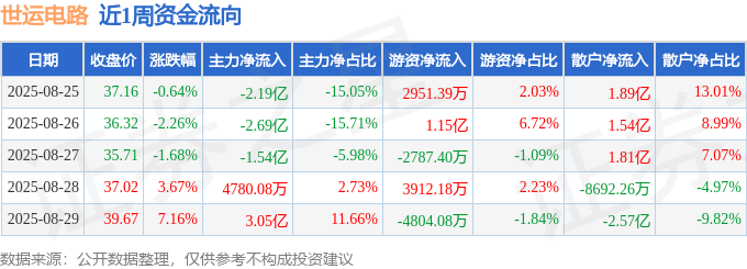 资金流向数据方面,本周世运电路主力资金合计净流出2.89亿元,游资资金合计净流入1.08亿元,散户资金合计净流入1.81亿元。本周资金流向一览见下表: