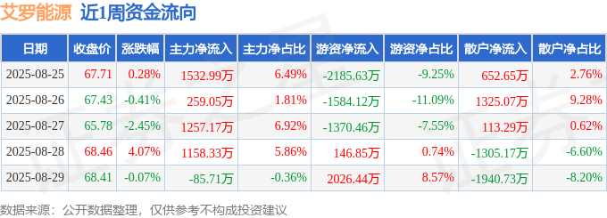资金流向数据方面,本周艾罗能源主力资金合计净流入4121.82万元,游资资金合计净流出2966.93万元,散户资金合计净流出1154.89万元。本周资金流向一览见下表: