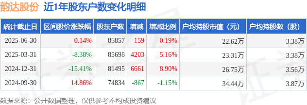 从股价来看,2025年3月31日至2025年6月30日,韵达股份区间涨幅为0.14%,在此期间股东户数增加159.0户,增幅为0.19%。