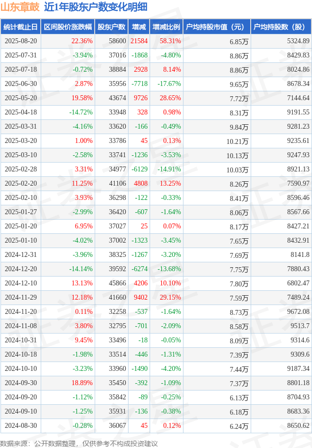 从股价来看,2025年7月31日至2025年8月20日,山东章鼓区间涨幅为22.36%,在此期间股东户数增加2.16万户,增幅为58.31%。