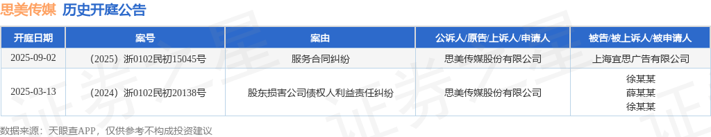 根据统计,近一年内以思美传媒股份有限公司为当事人的历史开庭公告有2则,其中案由为“服务合同纠纷”的公告以1则居首,其次为“股东损害公司债权人利益责任纠纷”有1则。历史开庭公告如下: