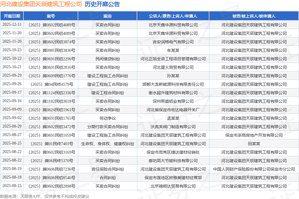 案号:(2025)冀0691民初1765号根据统计,近一年内以河北建设集团天辰建筑工程有限公司为当事人的历史开庭公告有154则,其中案由为“买卖合同纠纷”的公告以59则居首,其次为“建设工程施工合同纠纷”有26则,“合同纠纷”有13则。历史开庭公告(前20条)如下: