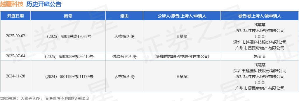 根据统计,近一年内以深圳市越疆科技股份有限公司为当事人的历史开庭公告有3则,其中案由为“人格权纠纷”的公告以2则居首,其次为“借款合同纠纷”有1则。历史开庭公告如下:
