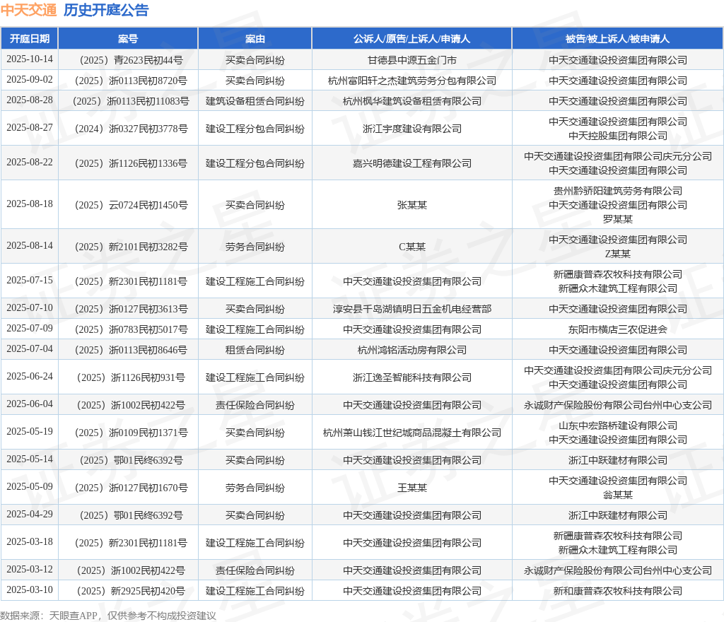 案号:(2025)浙0113民初8720号根据统计,近一年内以中天交通建设投资集团有限公司为当事人的历史开庭公告有42则,其中案由为“买卖合同纠纷”的公告以15则居首,其次为“建设工程施工合同纠纷”有8则,“建设工程分包合同纠纷”有4则。历史开庭公告(前20条)如下: