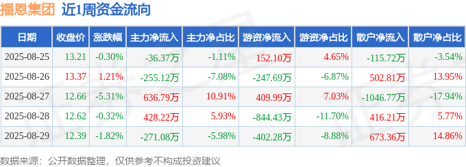 资金流向数据方面,本周播恩集团主力资金合计净流入502.44万元,游资资金合计净流出932.32万元,散户资金合计净流入429.88万元。本周资金流向一览见下表: