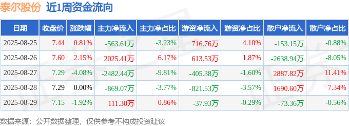 资金流向数据方面,本周泰尔股份主力资金合计净流出1778.42万元,游资资金合计净流入65.45万元,散户资金合计净流入1712.97万元。本周资金流向一览见下表: