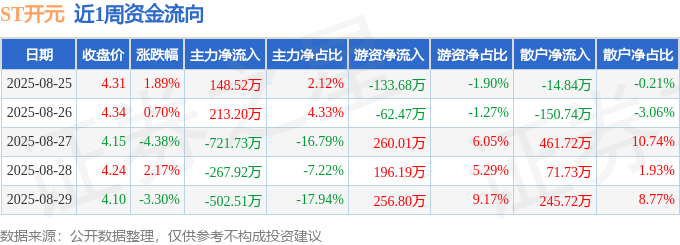 资金流向数据方面,本周ST开元主力资金合计净流出1130.45万元,游资资金合计净流入516.85万元,散户资金合计净流入613.6万元。本周资金流向一览见下表: