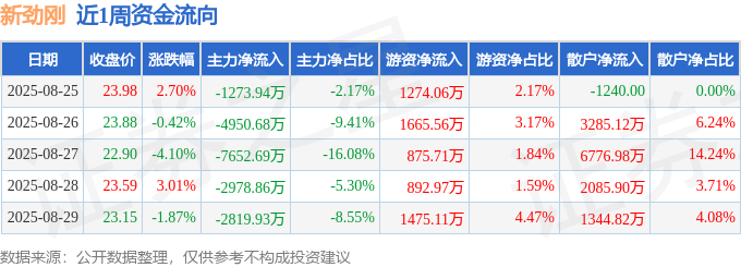 资金流向数据方面,本周新劲刚主力资金合计净流出1.97亿元,游资资金合计净流入6183.41万元,散户资金合计净流入1.35亿元。本周资金流向一览见下表: