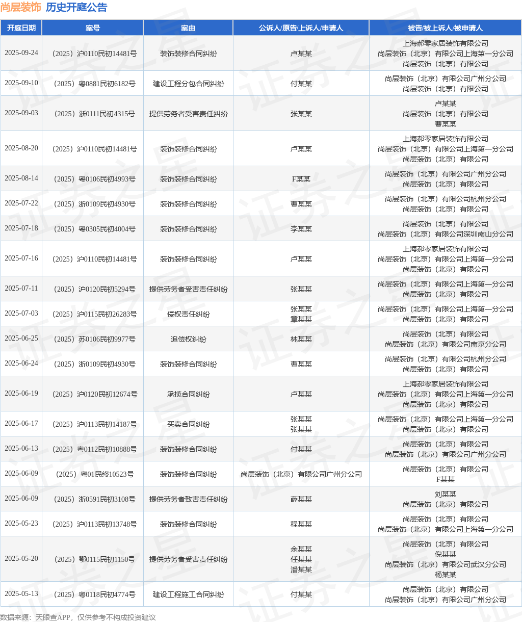 案号:(2025)浙0111民初4315号根据统计,近一年内以尚层装饰(北京)有限公司为当事人的历史开庭公告有54则,其中案由为“装饰装修合同纠纷”的公告以20则居首,其次为“提供劳务者受害责任纠纷”有18则,“承揽合同纠纷”有4则。历史开庭公告(前20条)如下: