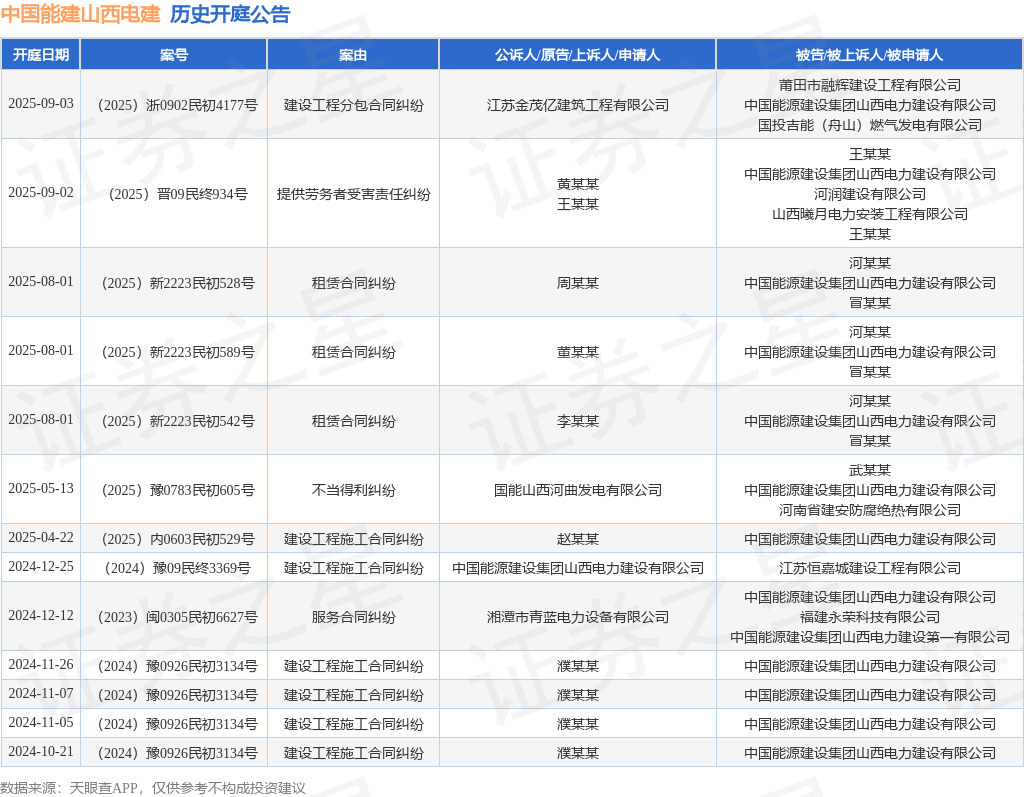 案号:(2025)浙0902民初4177号根据统计,近一年内以中国能源建设集团山西电力建设有限公司为当事人的历史开庭公告有13则,其中案由为“建设工程施工合同纠纷”的公告以6则居首,其次为“租赁合同纠纷”有3则,“不当得利纠纷”有1则。历史开庭公告如下: