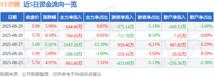 8月29日的资金流向数据方面,主力资金净流入644.66万元,占总成交额8.83%,游资资金净流出375.14万元,占总成交额5.14%,散户资金净流出269.53万元,占总成交额3.69%。