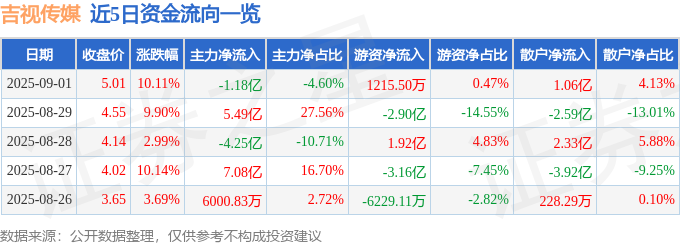 证券之星消息,吉视传媒9月1日涨停收盘,收盘价5.01元。该股于9点31分涨停,1次打开涨停,截止收盘封单资金为1.81亿元,占其流通市值1.03%。