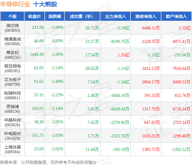 个股表现方面,半导体行业当日领跌股为瑞芯微(603893),该股当日报收233.99,下跌5.0%,成交量26.71万,主力资金净流出2.19亿元。博通集成(603068)以下跌4.03%紧随其后,该股当日成交量23.57万,主力资金净流出8299.76万元。除此之外,寒武纪(688256)、复旦微电(688385)、艾为电子(688798)均进入当日熊股之列。具体个股列表见下表: