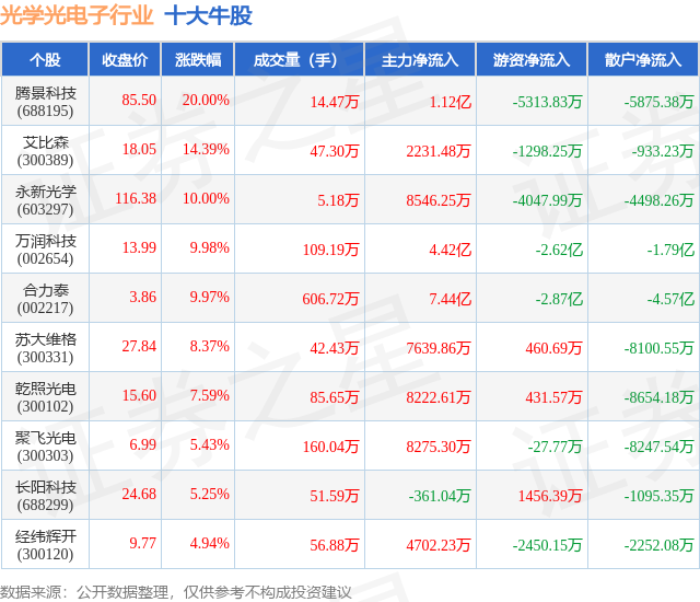 个股表现方面,光学光电子行业当日领涨股为腾景科技(688195),该股当日报收85.5,上涨20.0%,成交量14.47万,主力资金净流入1.12亿元。艾比森(300389)以上涨14.39%紧随其后,该股当日成交量47.3万,主力资金净流入2231.48万元。除此之外,永新光学(603297)、万润科技(002654)、合力泰(002217)均进入当日牛股之列。具体个股列表见下表: