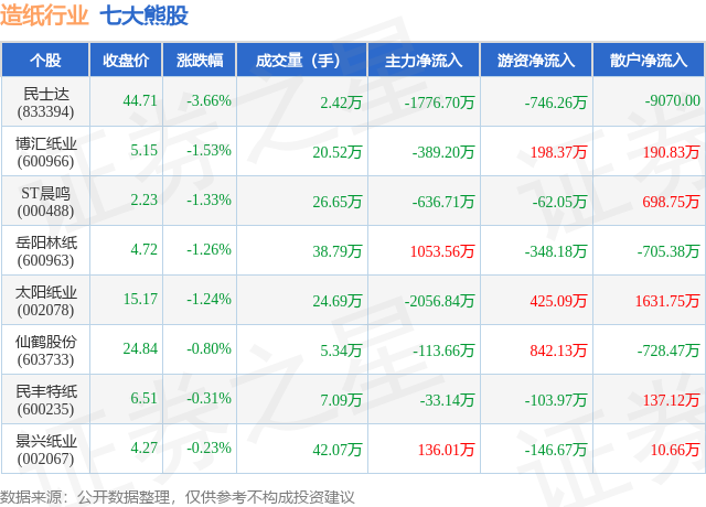个股表现方面,造纸行业当日领跌股为民士达(833394),该股当日报收44.71,下跌3.66%,成交量2.42万,主力资金净流出1776.7万元。博汇纸业(600966)以下跌1.53%紧随其后,该股当日成交量20.52万,主力资金净流出389.2万元。除此之外,ST晨鸣(000488)、岳阳林纸(600963)、太阳纸业(002078)均进入当日熊股之列。具体个股列表见下表: