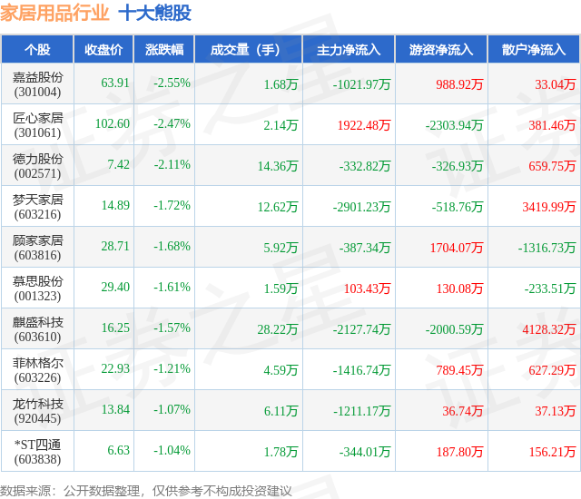 个股表现方面,家居用品行业当日领跌股为嘉益股份(301004),该股当日报收63.91,下跌2.55%,成交量1.68万,主力资金净流出1021.97万元。匠心家居(301061)以下跌2.47%紧随其后,该股当日成交量2.14万,主力资金净流入1922.48万元。除此之外,德力股份(002571)、梦天家居(603216)、顾家家居(603816)均进入当日熊股之列。具体个股列表见下表: