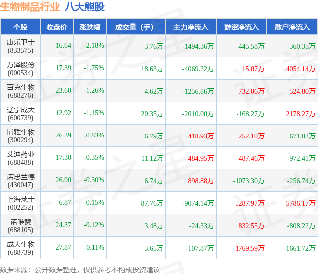 个股表现方面,生物制品行业当日领跌股为康乐卫士(833575),该股当日报收16.64,下跌2.18%,成交量3.76万,主力资金净流出1494.36万元。万泽股份(000534)以下跌1.75%紧随其后,该股当日成交量18.63万,主力资金净流出4069.22万元。除此之外,百克生物(688276)、辽宁成大(600739)、博雅生物(300294)均进入当日熊股之列。具体个股列表见下表:
