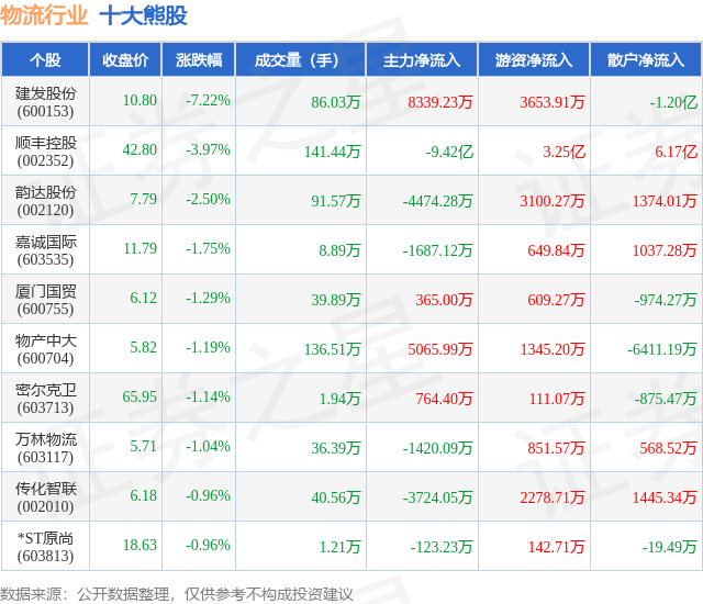 个股表现方面,物流行业当日领跌股为建发股份(600153),该股当日报收10.8,下跌7.22%,成交量86.03万,主力资金净流入8339.23万元。顺丰控股(002352)以下跌3.97%紧随其后,该股当日成交量141.44万,主力资金净流出9.42亿元。除此之外,韵达股份(002120)、嘉诚国际(603535)、厦门国贸(600755)均进入当日熊股之列。具体个股列表见下表: