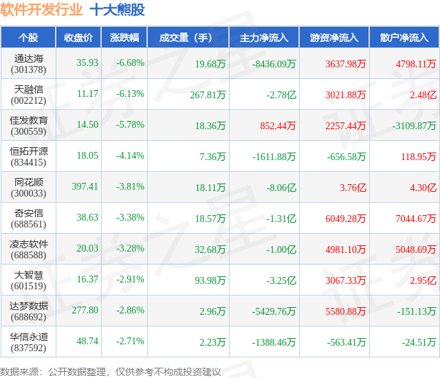 个股表现方面,软件开发行业当日领跌股为通达海(301378),该股当日报收35.93,下跌6.68%,成交量19.68万,主力资金净流出8436.09万元。天融信(002212)以下跌6.13%紧随其后,该股当日成交量267.81万,主力资金净流出2.78亿元。除此之外,佳发教育(300559)、恒拓开源(834415)、同花顺(300033)均进入当日熊股之列。具体个股列表见下表: