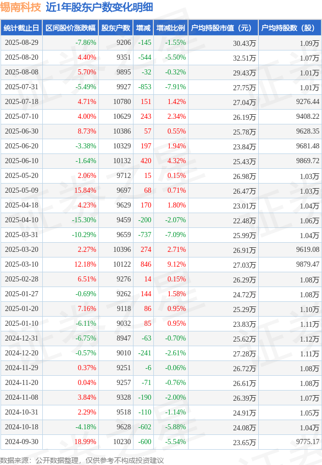 从股价来看,2025年8月20日至2025年8月29日,锡南科技区间跌幅为7.86%,在此期间股东户数减少145.0户,减幅为1.55%。