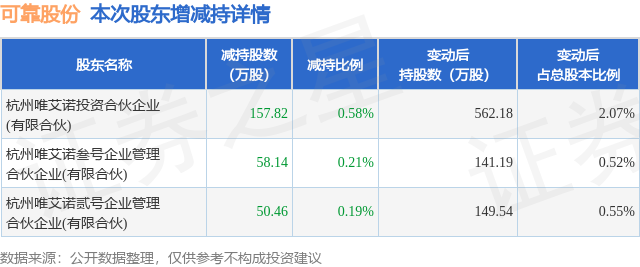 证券之星消息,9月1日可靠股份发布公告《可靠股份:关于特定股东减持股份进展暨权益变动触及1%的公告》,其股东杭州唯艾诺投资合伙企业(有限合伙)、杭州唯艾诺叁号企业管理合伙企业(有限合伙)、杭州唯艾诺贰号企业管理合伙企业(有限合伙)于2025年8月25日至2025年8月29日间合计减持266.42万股,占公司目前总股本的0.98%,变动期间该股股价下跌10.15%,截止8月29日收盘报14.52元。