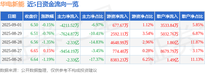 证券之星消息,截至2025年9月1日收盘,华电新能(600930)报收于6.5元,下跌0.15%,换手率3.72%,成交量93.12万手,成交额6.04亿元。
