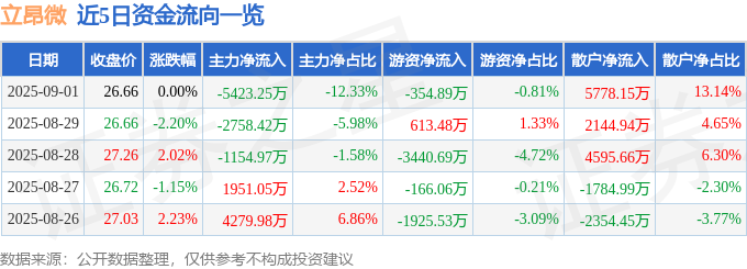 9月1日的资金流向数据方面,主力资金净流出5423.25万元,占总成交额12.33%,游资资金净流出354.89万元,占总成交额0.81%,散户资金净流入5778.15万元,占总成交额13.14%。