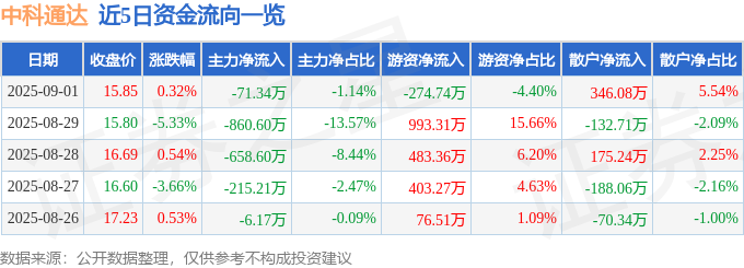 证券之星消息,截至2025年9月1日收盘,中科通达(688038)报收于15.85元,上涨0.32%,换手率3.35%,成交量3.89万手,成交额6246.44万元。