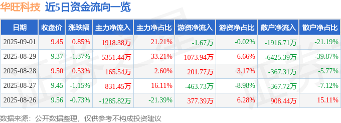 证券之星消息,截至2025年9月1日收盘,华旺科技(605377)报收于9.45元,上涨0.85%,换手率1.72%,成交量9.58万手,成交额9045.73万元。