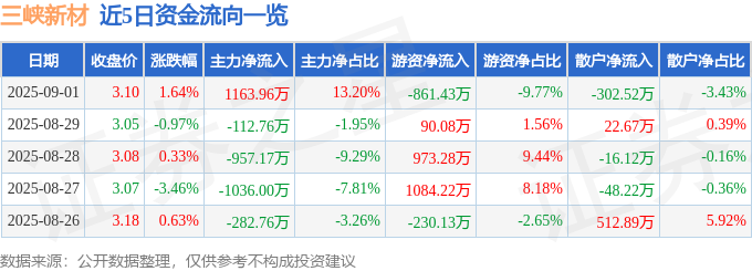 9月1日的资金流向数据方面,主力资金净流入1163.96万元,占总成交额13.2%,游资资金净流出861.43万元,占总成交额9.77%,散户资金净流出302.52万元,占总成交额3.43%。