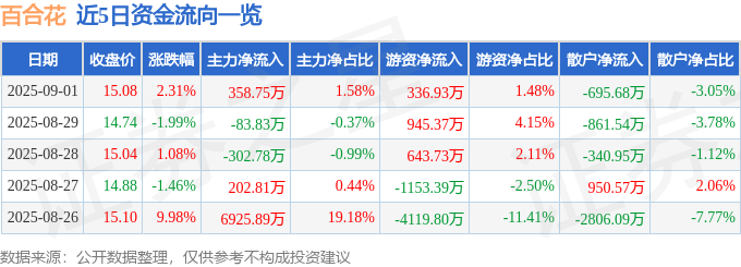 证券之星消息,截至2025年9月1日收盘,百合花(603823)报收于15.08元,上涨2.31%,换手率3.67%,成交量15.07万手,成交额2.28亿元。