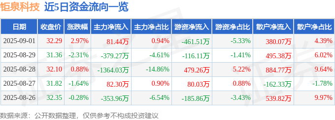 证券之星消息,截至2025年9月1日收盘,钜泉科技(688391)报收于32.29元,上涨2.97%,换手率4.73%,成交量2.71万手,成交额8658.88万元。