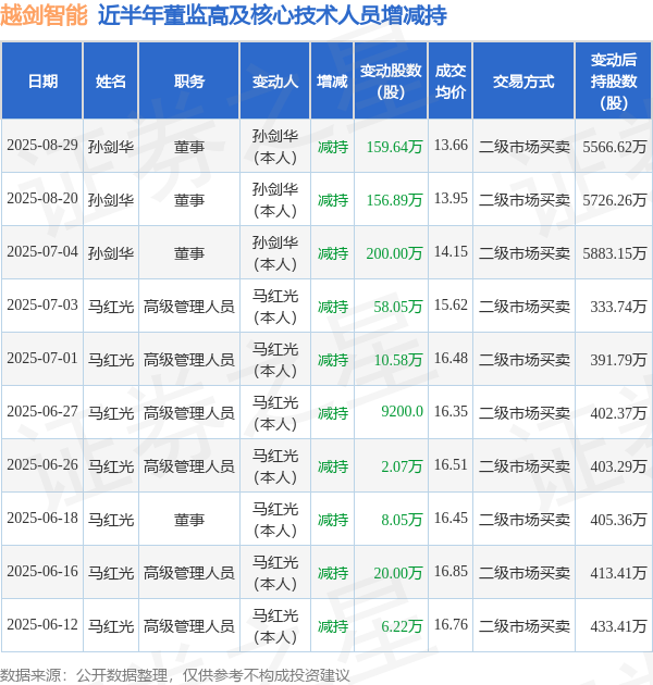 越剑智能近半年内的董监高及核心技术人员增减持详情如下: