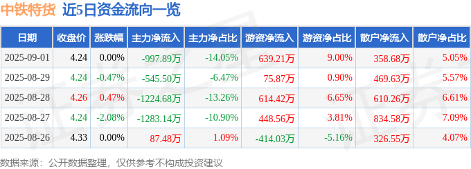 证券之星消息,截至2025年9月1日收盘,中铁特货(001213)报收于4.24元,上涨0.0%,换手率0.38%,成交量16.77万手,成交额7103.51万元。