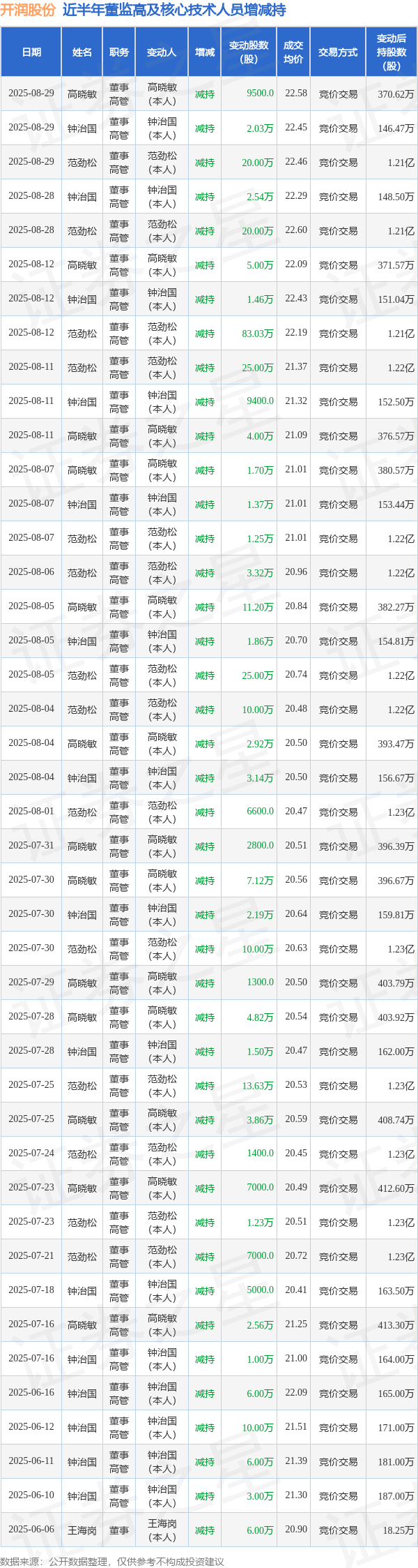 开润股份近半年内的董监高及核心技术人员增减持详情如下: